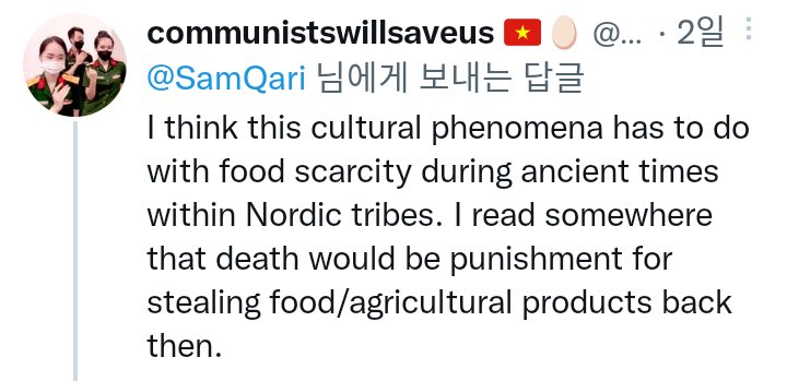 난 북유럽인들이 고대에 음식부족으로 고통받아서 생긴 현상이라고 생각해. 어디서 읽었는데, 음식 훔치면 사형이었다며?