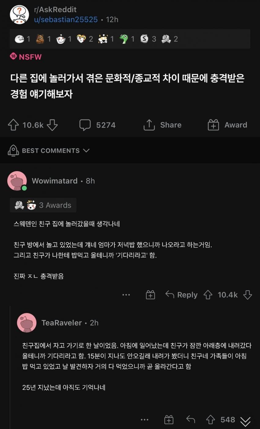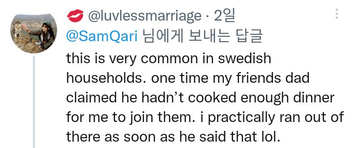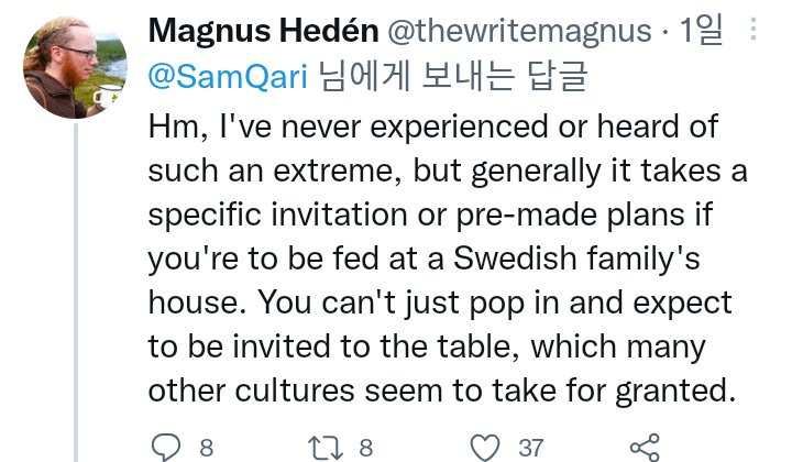 흐음, 난 이런 극단적인건 안 겪어봤지만 보통 너가 스웨덴 친구 집에서 밥먹고 싶으면 미리 약속해놔야해. 그냥 막 등장해서 식탁에 초대받길 바라면 안되지. 다른 문화들에선 당연한듯이 받아주는거 같지만 말이야
