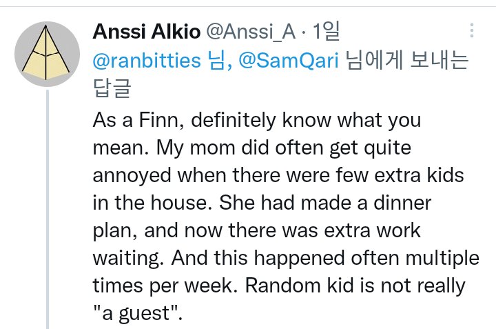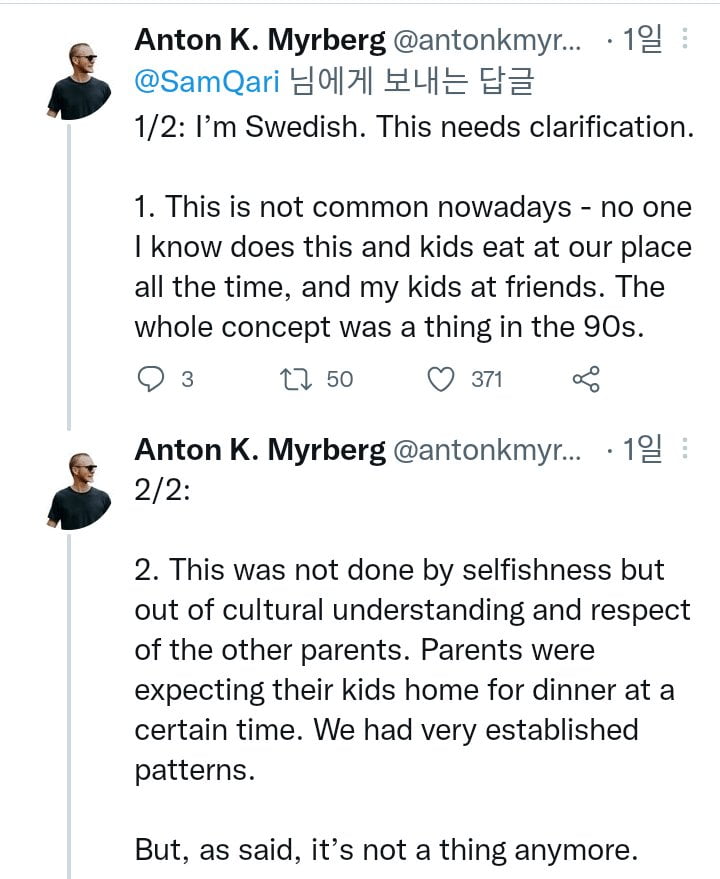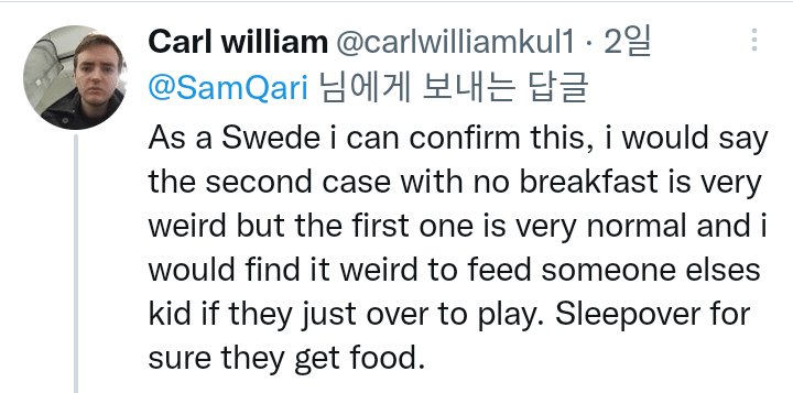 스웨덴인으로서 2번째의 아침 안주는건 굉장히 이상하지만 첫번째는 평범한 일이지. 애들이 그냥 와서 노는건데 다른가족 애한테 밥먹이는건 이상한거야. 자고가는건 당연히 먹여야하지만.