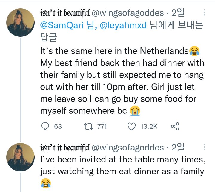네덜란드도 똑같아😂 내 친구가 자기 가족이랑만 저녁 먹으면서 동시에 내가 그집에 10pm 이후까지 있길 원하더라고. 야 날 걍 밥좀 사먹을수있게 보내줘😢