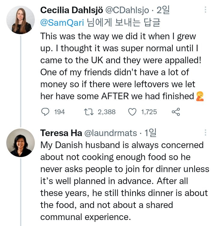 내 덴마크 남편도 언제나 미리 약속안된 사람들이 식사에 참여해서 음식이 부족해질까봐 걱정했어. 이렇게 시간이 많이 흘렀는데도 아직 그는 저녁식사는 먹는 시간이지 서로 친교를 나누는 시간이 아니라고 생각해