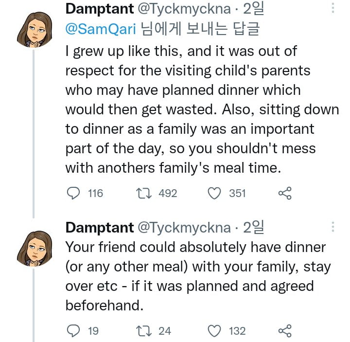 우리 가족이라면 100% 식사를 주겠지만, 친구 가족들이 밥먹는 동안 친구 방에 앉아 있는건 흔한일이고 나는 그것에 대해 슬퍼한 적 없어. 우린 원래 그래 하하하하'