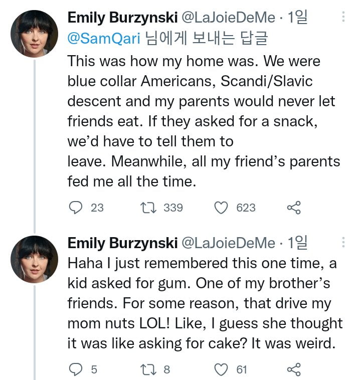 이거 딱 우리 가족이 이랬어. 우리 가족은 스칸디나비아 / 슬라브 (북유럽) 계통 노동자 가족이었는데, 우리 부모님은 절대 친구들이 못 먹게 했어. 만약 걔네들이 간식을 요청하면 우린 떠나라고 해야 했지. 반면에 내 친구 부모님들은 날 먹여주셨고.