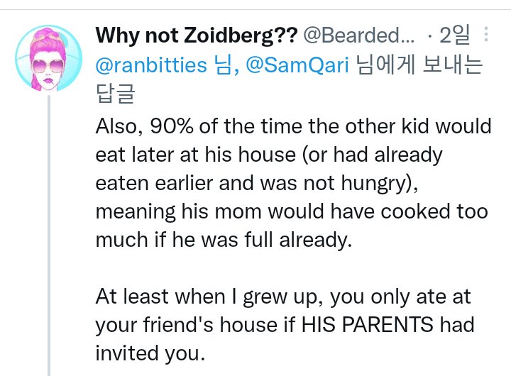 우리 엄마도 집에 애들 몇명 놀러오는거를 가끔 엄청 화냈거든. 이미 식사스케줄을 다 짜놨는데 일이 추가로 생기는 거잖아. 이건 일주일에도 몇번이나 있던 일이야. 집에 놀러오는 애들은 환영받는 손님이 아니야